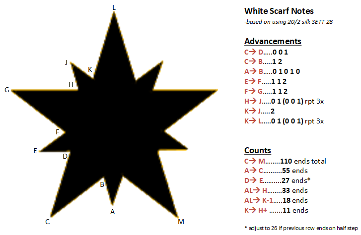 In planning to weave the White Scarf with an Ansteorran star, I looked for a structure that had a good balance of strength vs flexibility. For this, I wanted a balance of plainweave and twill. I settled on the following two drafts. (click image to download WIF)